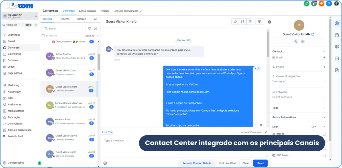Um bom atendimento ao cliente pode ser o diferencial que leva o seu negócio ao próximo nível. Com a It'scom, você tem à disposição um Contact Center completo, integrado ao WhatsApp Oficial e ferramentas de automação para suporte. Aumente a satisfação do cliente, reduza o tempo de resposta e mantenha todas as conversas centralizadas em um só lugar.